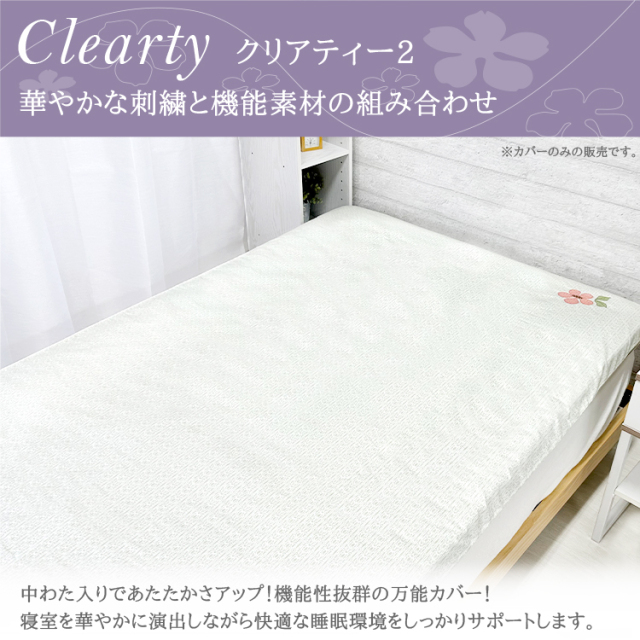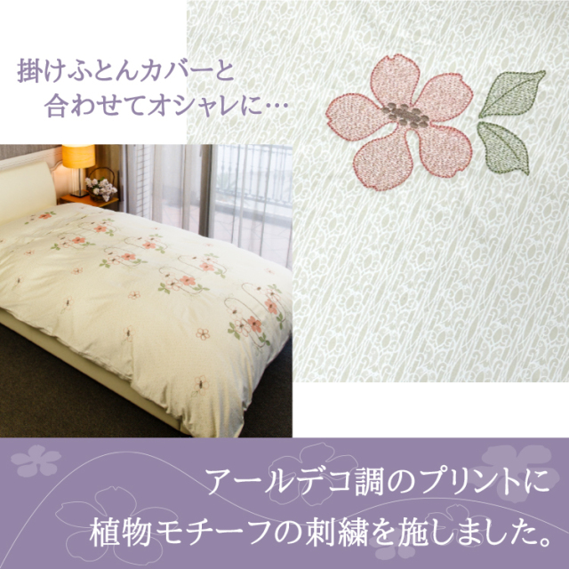 | あたたまりやすく冷めにくい高機能わた、「オーラ80わた」を採用した上品な刺繍デザインで寝室を華やかに演出するマルハチオリジナルの中綿入りカバー。 |