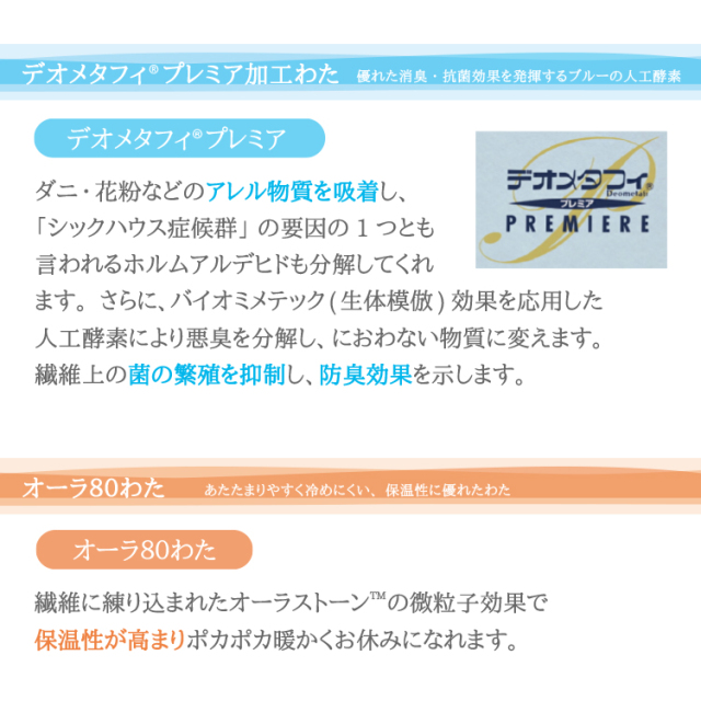 | すぐれた消臭・抗菌効果を発揮する「デオメタフィ®プレミア加工わた」を採用したマルハチオリジナルの中綿入りカバー。 |